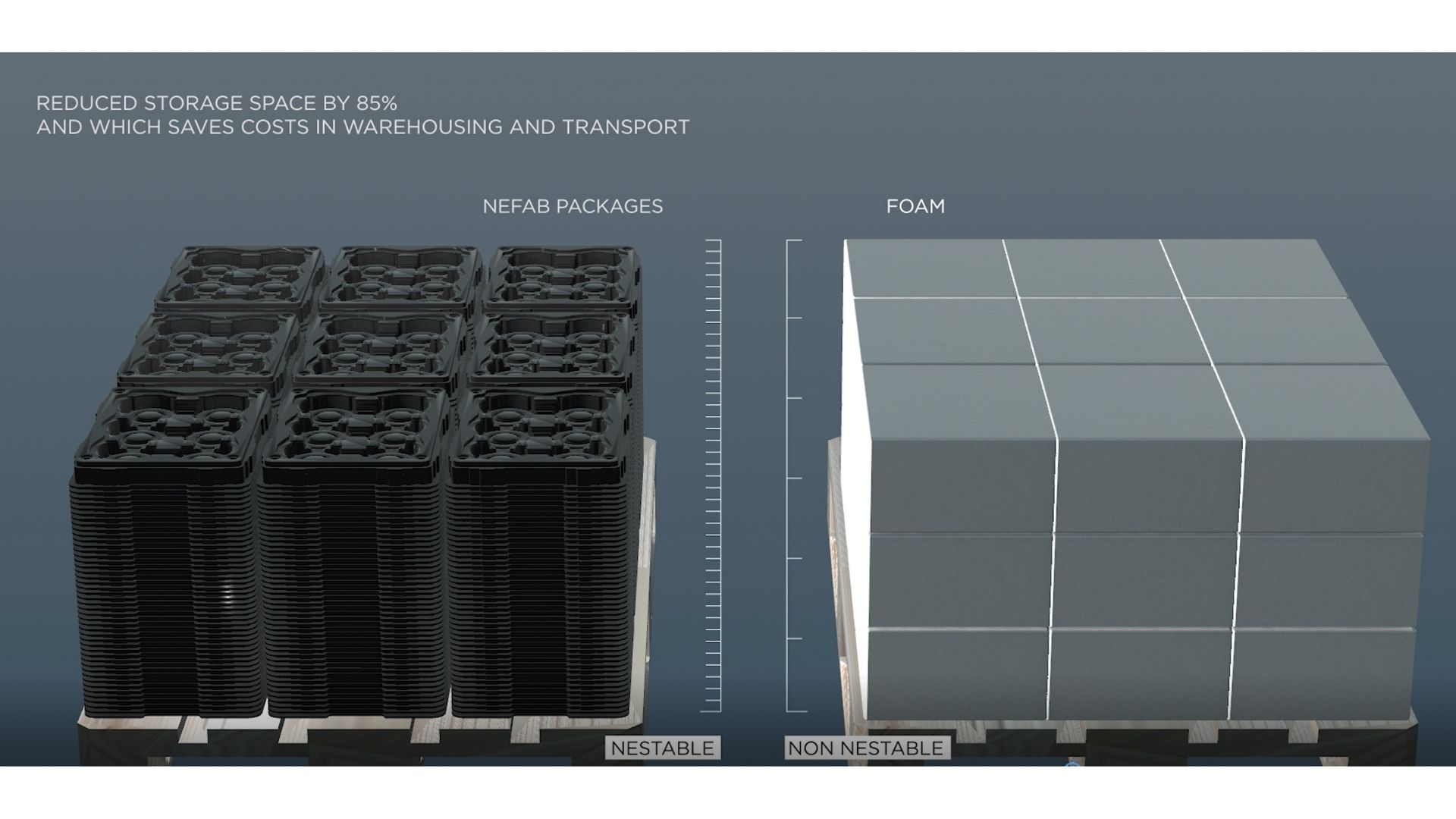 When compared to foam, thermoformed plastics perform better in terms of nestability, saving costs in handling and logistics in supply chains. Besides significant material and cost savings, thermoplastics also contribute to lower CO2 emissions when compared to foam.