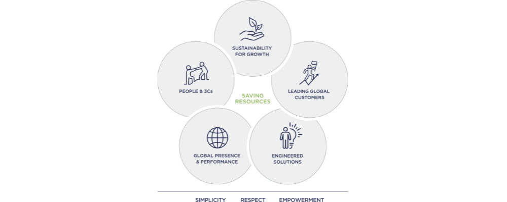 Nossa estratégia se baseia em nossos 75 anos de história, em nossos valores fundamentais e no forte propósito de economizar recursos. Para nossa estratégia de 2030, nos concentramos em 5 áreas de foco estratégico.