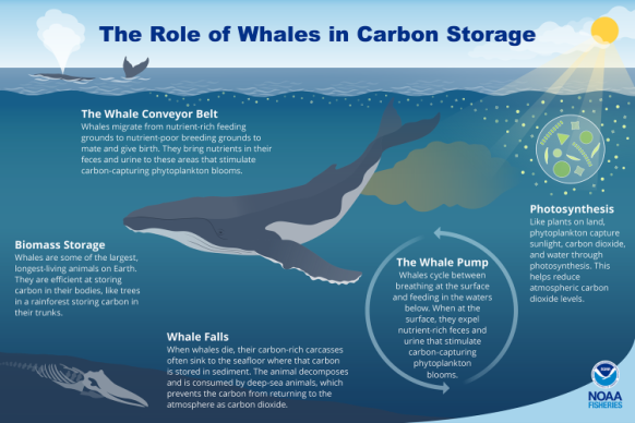 Whales are at the top of the food chain and have an important role in the overall health of the marine environment. Whales play a significant role in capturing carbon from the atmosphere; each great whale sequesters an estimated 33 tons of CO2 on average, thus playing their part in the fight against climate change. How Do Whales Contribute to Carbon Storage and Nutrient Cycling? Like trees in a rainforest or marine algae in a kelp forest, whales are efficient at capturing and storing atmospheric carbon directly in their large bodies throughout their long lives. When whales die, their carbon-rich carcasses often sink to the seafloor; that carbon is trapped and prevented from returning to the atmosphere as carbon dioxide. Whales also indirectly contribute to carbon capture by providing nutrient-rich waste to phytoplankton, which absorb large amounts of carbon dioxide.