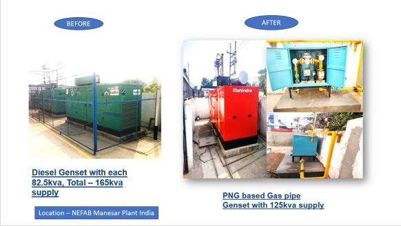 NEFAB INDIA Manesar Plant installed new PNG based Gas Genset with PNG meter & gas pipeline successfully commission and run with loading. Reason for Requirement: - The Central Pollution Control Board (CPCB) has proposed to reduce pollution by banned all diesel Genset in Delhi NCR capital region older than 15 years. Benefit to NEFAB: - 1: Sustainable solution, Sources of power backup for plant running, fulfill Government guidelines and Annually 6.3 Ton Co2 saving. 2: PNG based Genset with “0” Carbon emission. 3: Safety: - Improvement of plant safety (Earlier purchased diesel and storage in plant i.e. manually operating and risk) Now in PNG case, pipeline direct connected with Genset with safety valves.