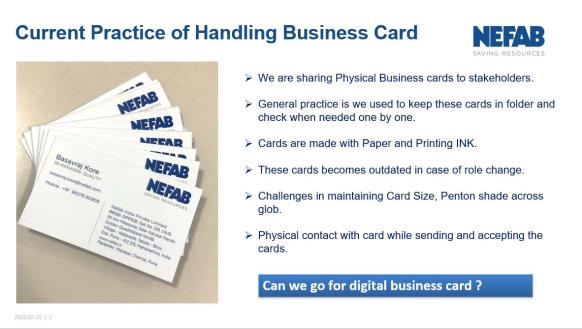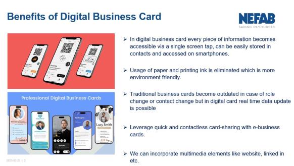 In digital business card every piece of information becomes accessible via a single screen tap, can be easily stored in contacts and accessed on smartphones. Usage of paper and printing ink is eliminated which is more environment friendly. Traditional business cards become outdated in case of role change or contact change but in digital card real time data update is possible. Leverage quick and contactless card-sharing with e-business cards. We can incorporate multimedia elements like website, linked in etc.