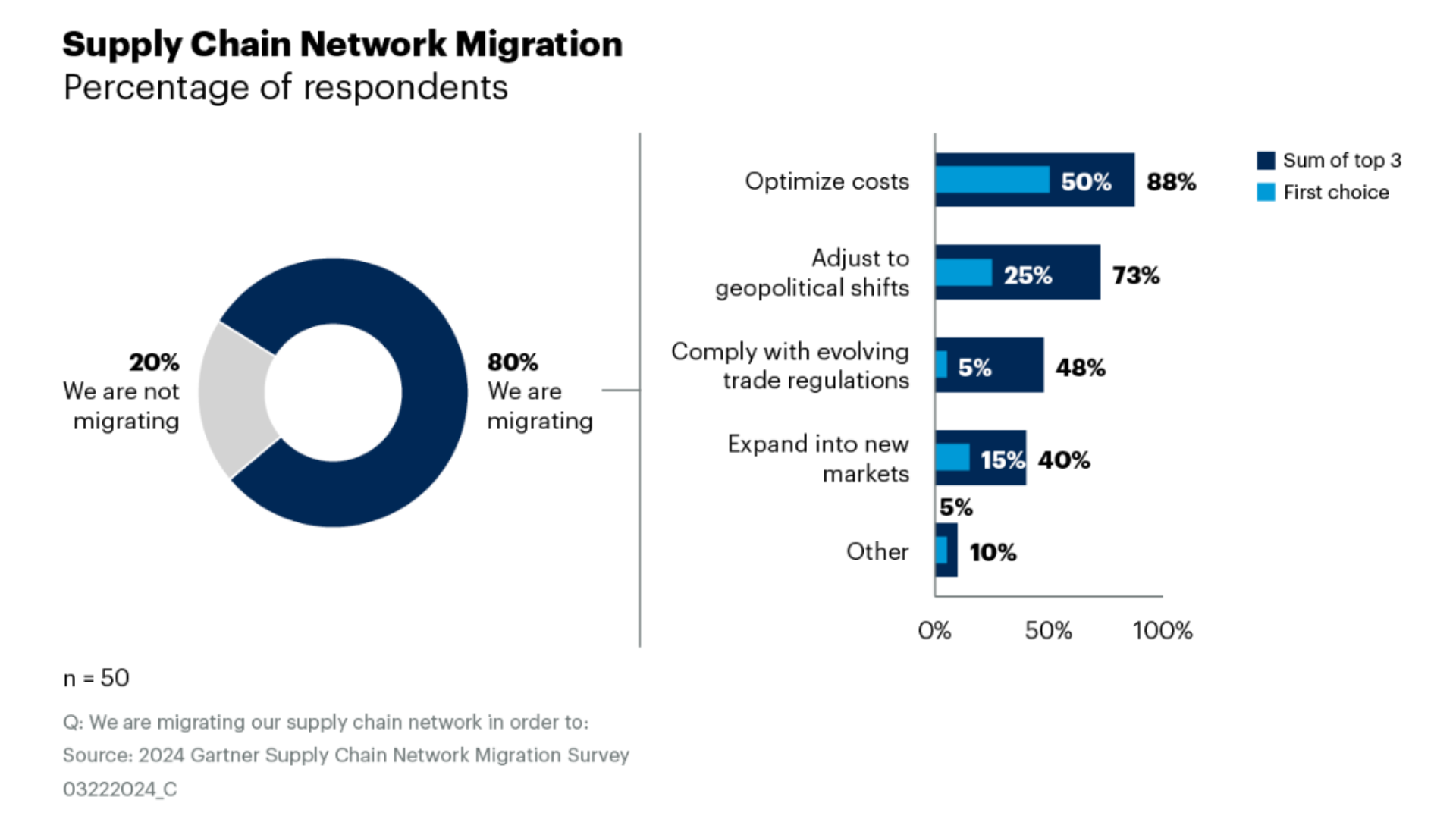 Jüngste Erhebungen zeigen, dass 80 % der leitenden Supply-Chain-Verantwortlichen planen, zumindest Teile ihres Supply-Chain-Netzes zu verlagern. Dieser Trend hat sich zwar über die Jahre hinweg gehalten, doch die Hauptmotivationen haben sich zunehmend in Richtung Kostensenkung und Risikominderung im Liefernetzwerk verschoben. Quelle: Gartner