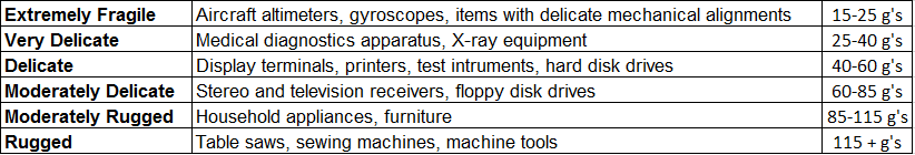 If the G-factor is estimated too high... the packaging will be under-designed and significant shipping damage is likely to occur. Please reference the above table for examples of sensitivities and G-values for commonly shipped objects.
