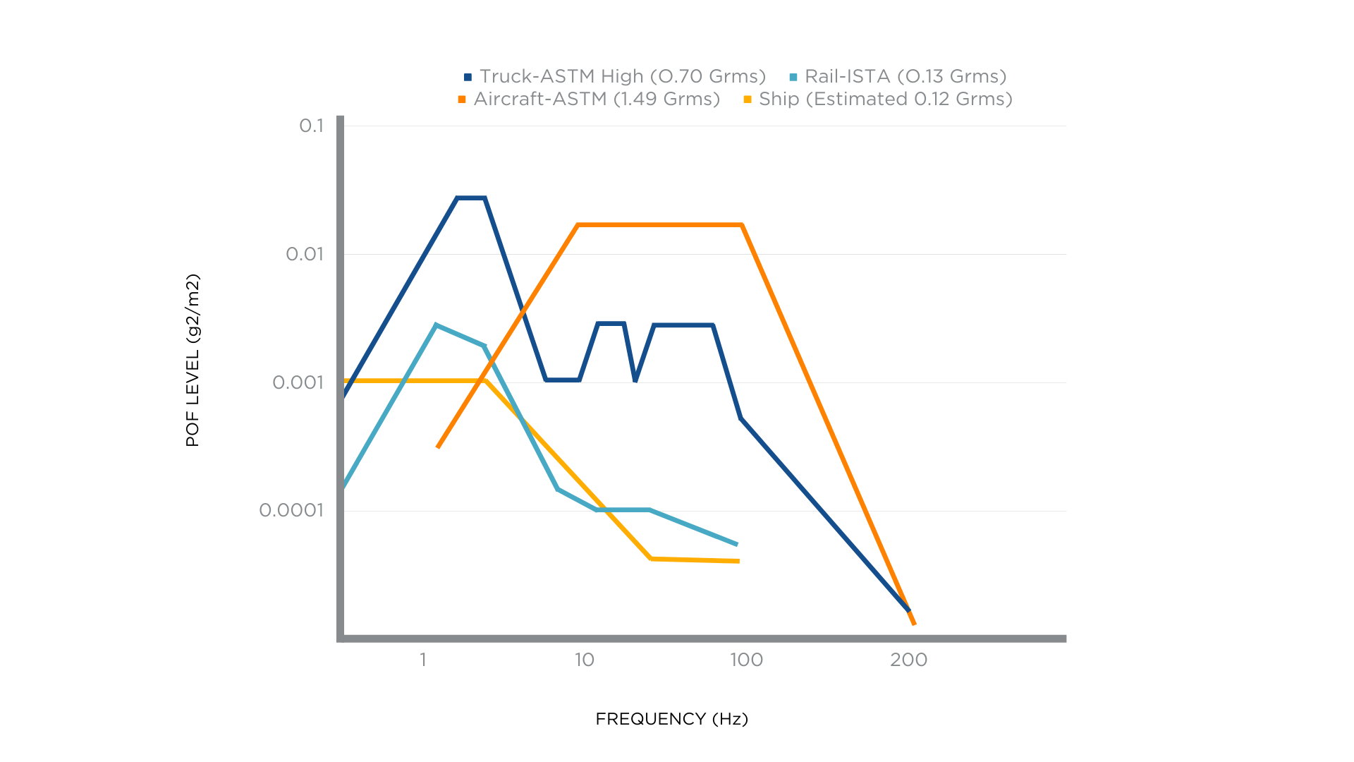 The above image presents the various ASTM 2016 vibration spectrums of four major modes of transportation: Truck, aircraft, rail, and ocean
