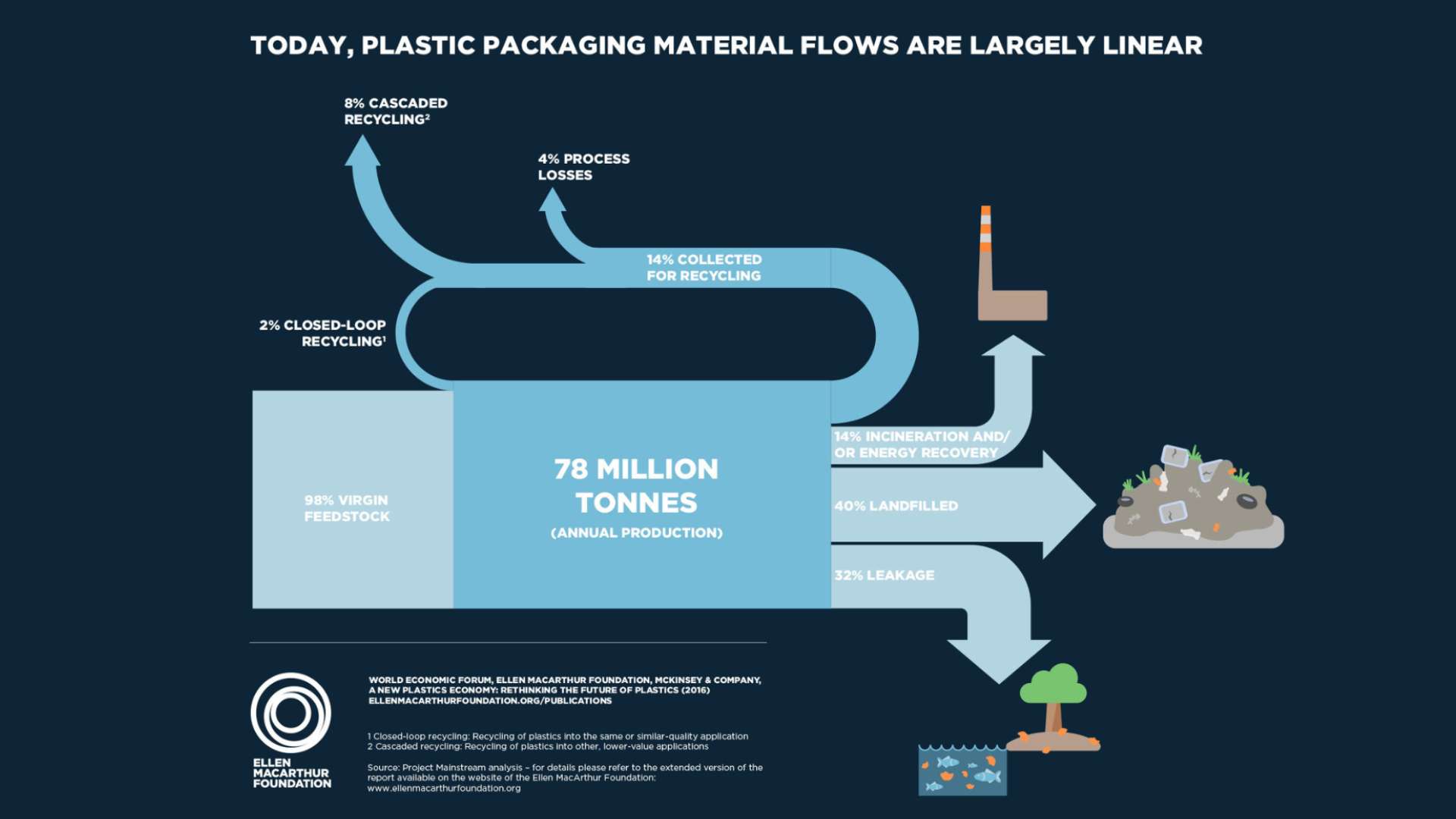According to Ellen MacArthur Foundation, currently, most of the plastic is incinerated, ends up in a landfill, or leaks into the environment