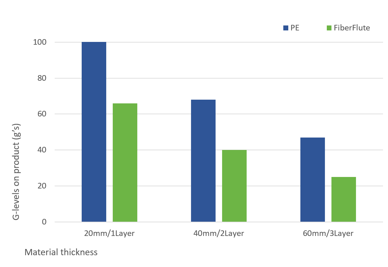 El resultado mostró valores G entre un 40 y un 45% inferiores para FiberFlute, lo que significa que se necesita menos material para proteger los productos cuando se utiliza FiberFlute en comparación con el polietileno.