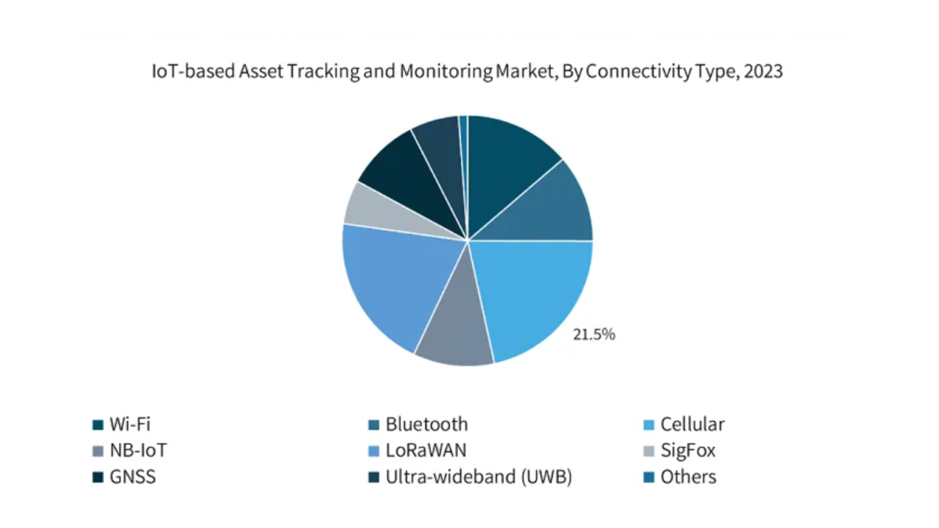 Mobiili- ja Bluetooth-yhteydet ovat parhaita vaihtoehtoja IoT-pohjaiseen omaisuuden seurantaan ja valvontaan, sillä ne tarjoavat vahvan yhteyden reaaliaikaiseen seurantaan ja tiedonsiirtoon. Myös muilla tekniikoilla, kuten Wi-Fi, LoRaWAN, NB-IoT ja ultralaajakaista (UWB), on ratkaiseva rooli näkyvyyden ja tehokkuuden parantamisessa. Lähde: Global Market Insights