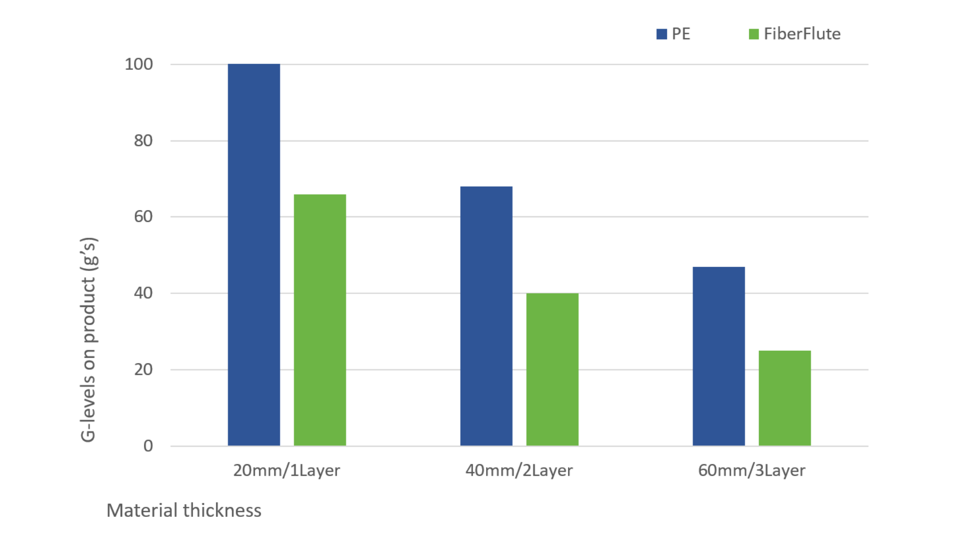 Un'analisi comparativa tra la schiuma di PE (30 kg/m³) e FiberFlute di Nefab ha mostrato che FiberFlute ha valori G inferiori del 40-45%. Ciò indica che con FiberFlute è necessario meno materiale per ottenere lo stesso livello di protezione dei prodotti rispetto alla schiuma PE.