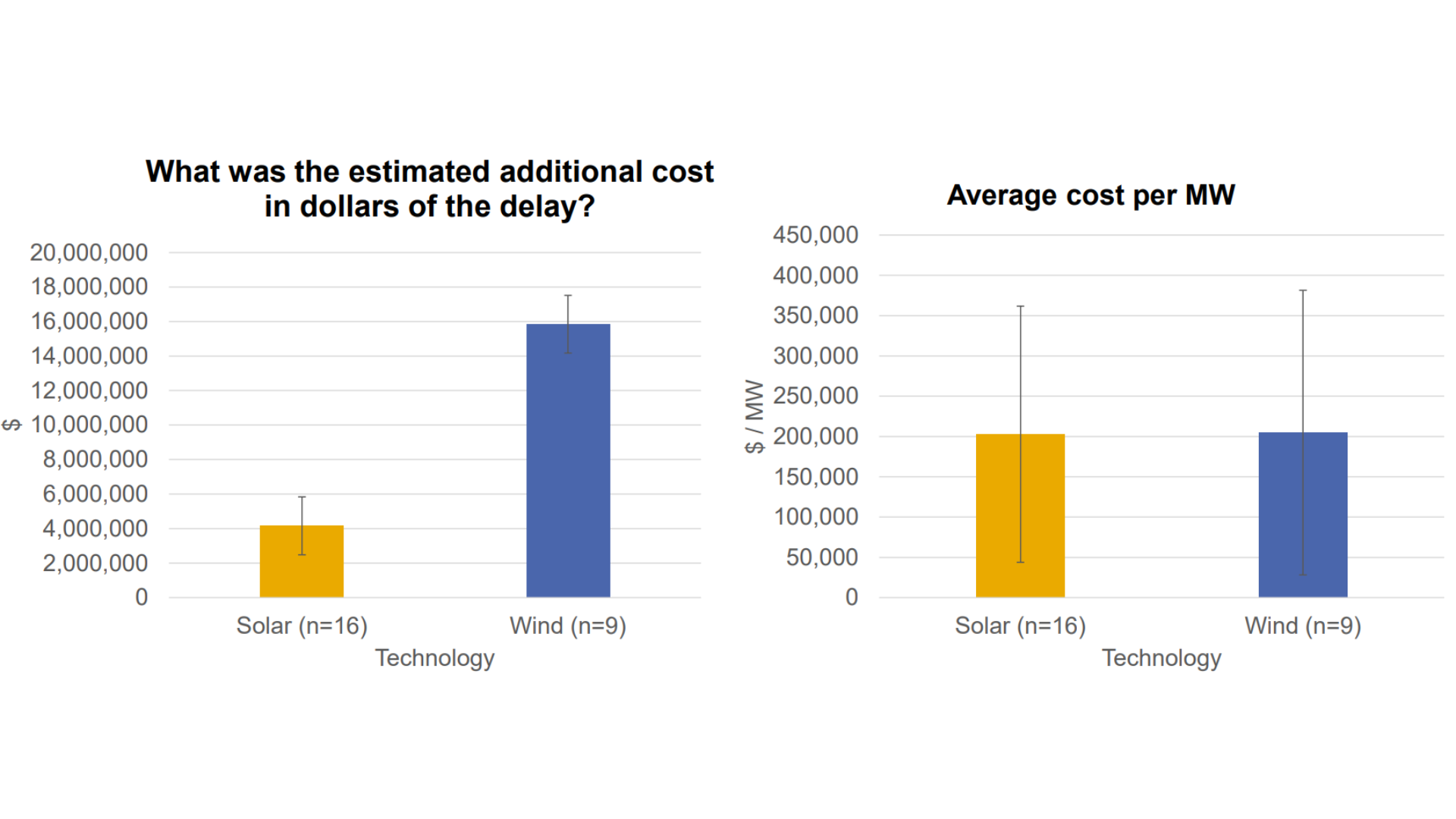 Mentre i costi medi per i ritardi dei progetti solari ed eolici si attestano sui 200.000 dollari, i costi stimati per i ritardi dei progetti eolici tendono a essere quattro volte superiori a quelli dei progetti solari. Fonte: Area Tecnologie Energetiche, Berkeley Lab11