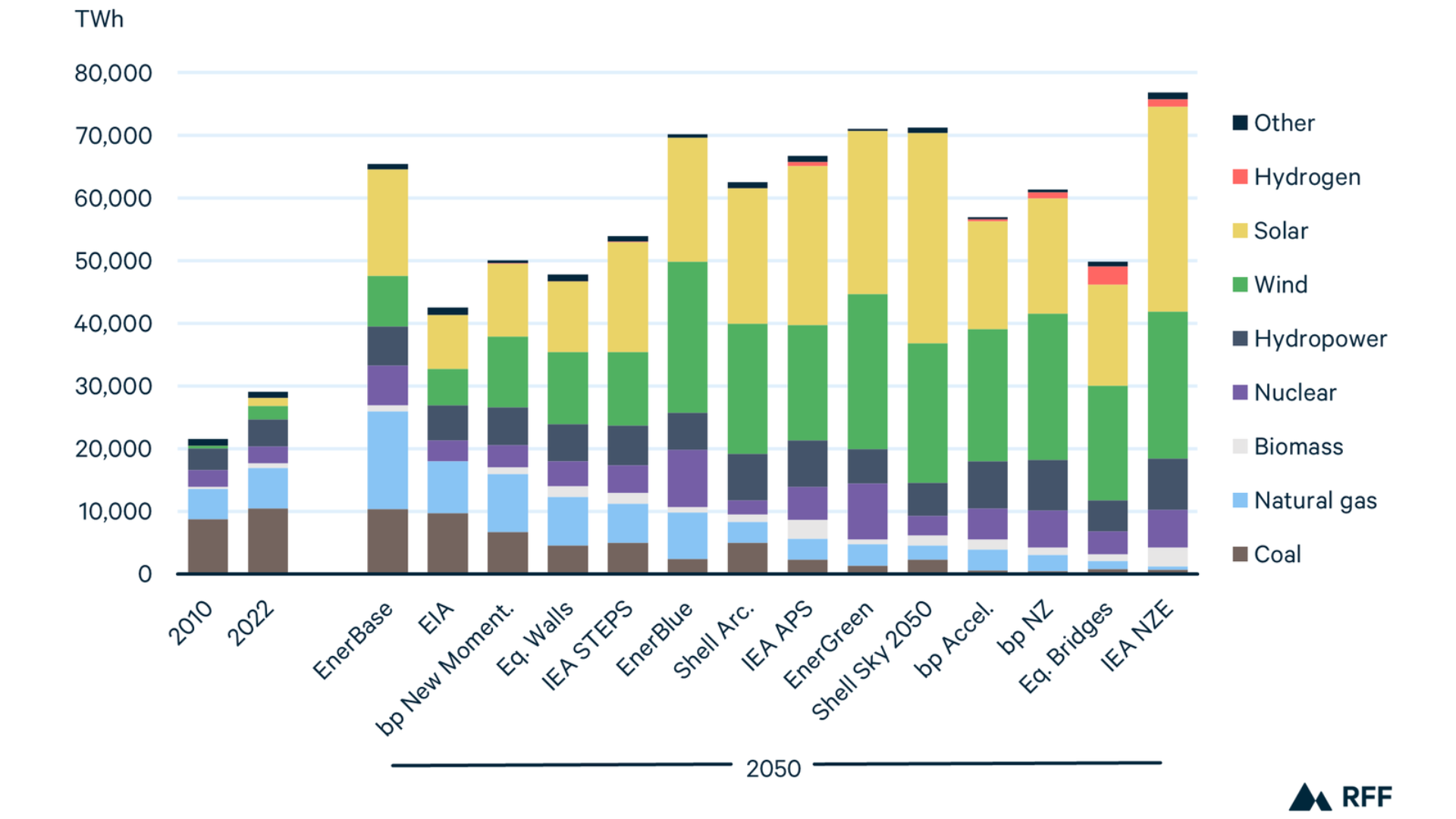 La domanda globale di elettricità aumenta rapidamente, trainata dall'energia eolica e solare. Fonte: Global Energy Outlook by RFF 7
