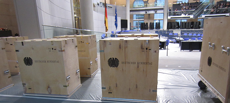 In a public invitation to tender, the Bundestag administration asked for a packaging solution which would allow for faster and easier storage of these desks in the plenary hall.