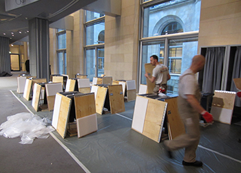 To be able to fit everyone in the plenary all desks and have been dismounted and replaced. In the past the desks have been packed in bubble foil which was extremely time consuming.