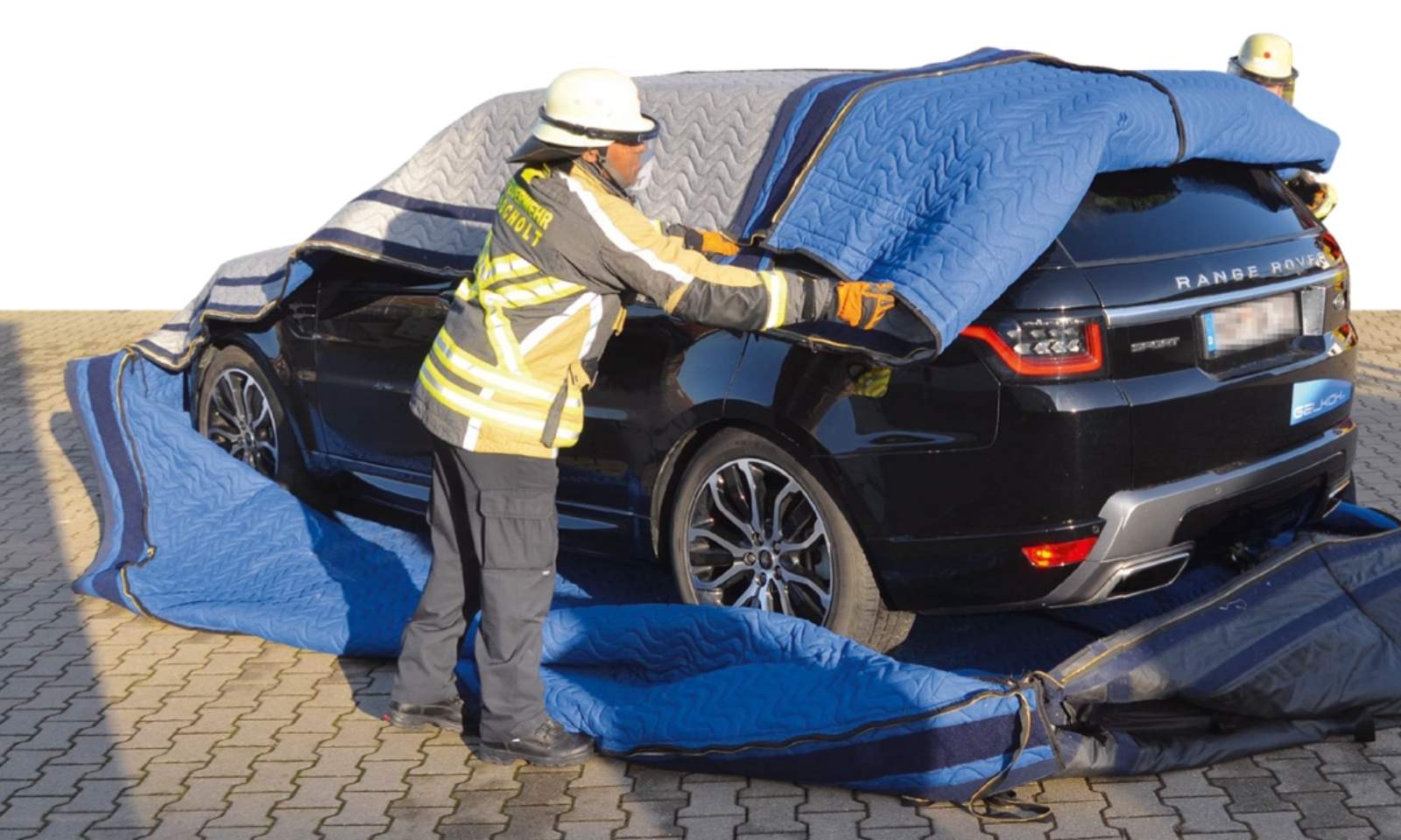 Fuchs goes on: "Two operators can secure one vehicle in as little as three minutes until the car is completely safe and the risk of fire is averted. The car first needs to be rolled or lifted onto the bottom part of the LiBa Rescue. Additional lengths are then attached and secured in a patented design, creating a high-tech, non-conductive safety solution. The woven material is 'self-extinguishing', meaning that if a fire should break out inside the battery, the heat emitted from the fire will release gases from the material that extinguishes the fire. This provides a safe and stable environment for the whole vehicle even during transport. The LiBa Rescue provides a passive gas-management system whereby highly toxic hydrofluoric acid (a critical element of the harmful gases emitted by a lithium-ion battery on the thermal runaway) is neutralized as it passes through the system. Finally, the bottom layer of the LiBa Rescue is manufactured with a ceramic lining which will prevent fuel from a hybrid vehicle entering the soil or surface water and damaging aquatic biospheres."