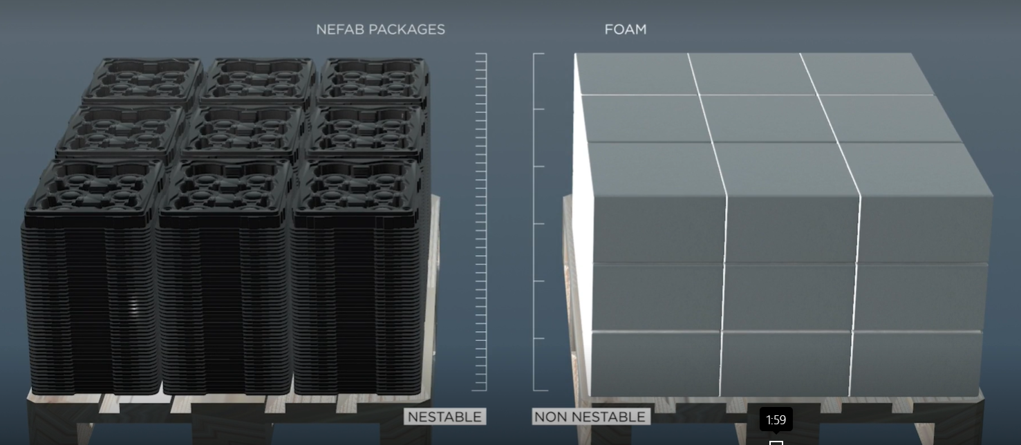 When compared to foam, thermoformed plastics perform better in terms of nestability, saving costs in handling and logistics in supply chains. Besides significant material and cost savings, thermoplastics also contribute to lower CO2 emissions when compared to foam.