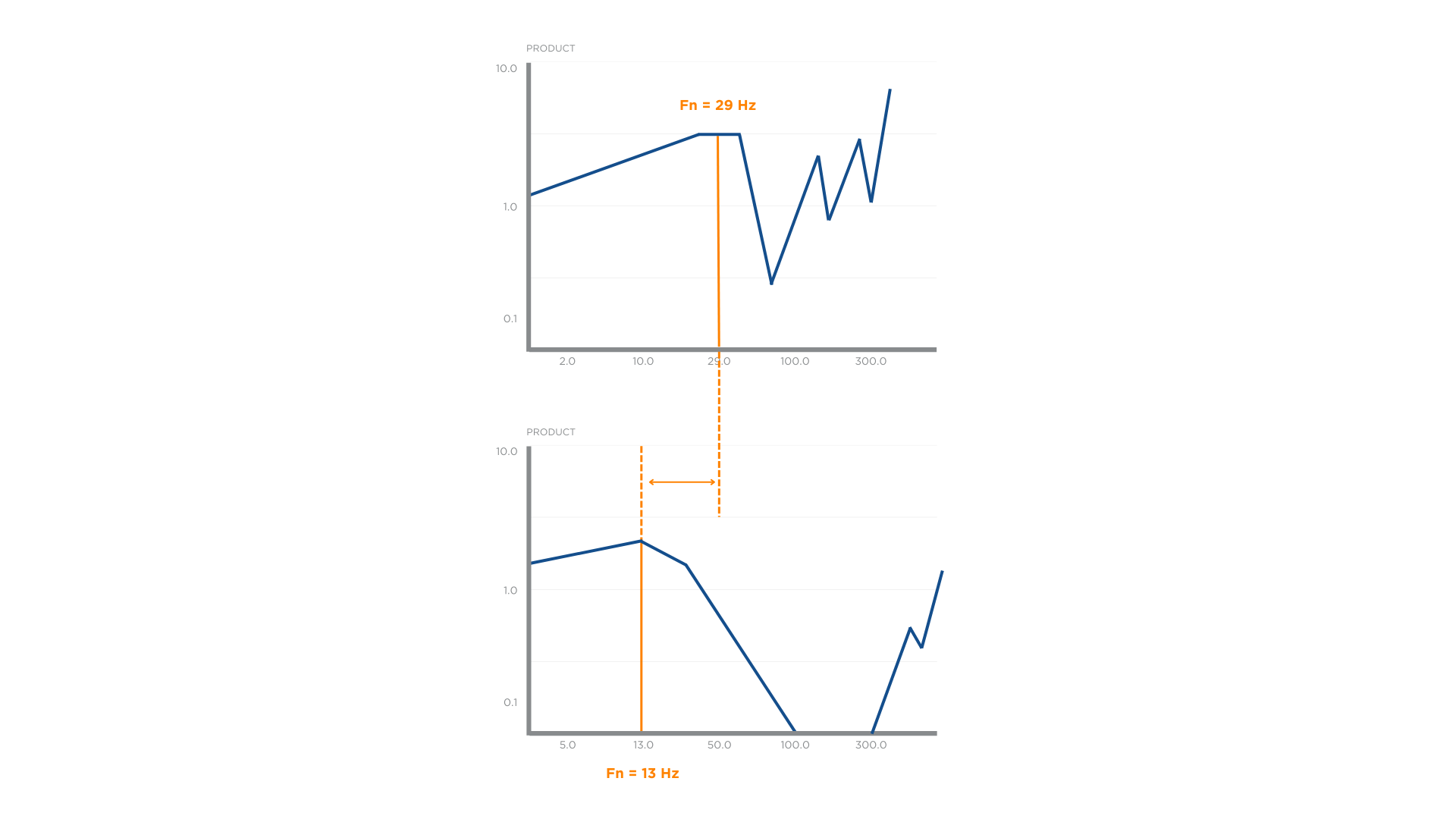 Typical product vibration test result showing optimal frequencies between the product and its packaging Typical product vibration test result showing optimal frequencies between the product and its packaging