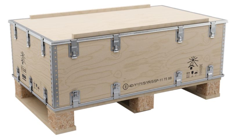This environmentally friendly packaging not only helps to protect the planet but also the packed products against difficult transport conditions, long-term storage, and climate conditions. Plywood has a higher strength to weight ratio than solid wood. It is made from thin layers of wood sheets with the grain direction of each piece glued and laid perpendicularly to build up desired thickness making it strong yet lightweight. The solid structure enables stacking abilities both in transit and warehousing without the risk of damages, while the low weight creates a cost-effective solution that is suitable for air, road, and rail transport. When combined with a steel profile, it creates a rigid, durable, yet lightweight solution that is ideal for both expendable and returnable packaging solutions while also meeting UN certification requirements for Dangerous Goods packaging.