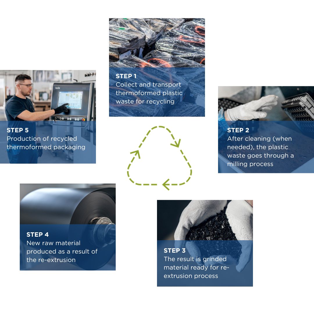 Nefab’s thermoformed solutions are designed with reduced materials and apply to circular flows. Once their life cycle ends, we collect our customers' thermoformed waste when possible, then clean, extrude, and reuse it as raw material to produce recycled thermoformed products.