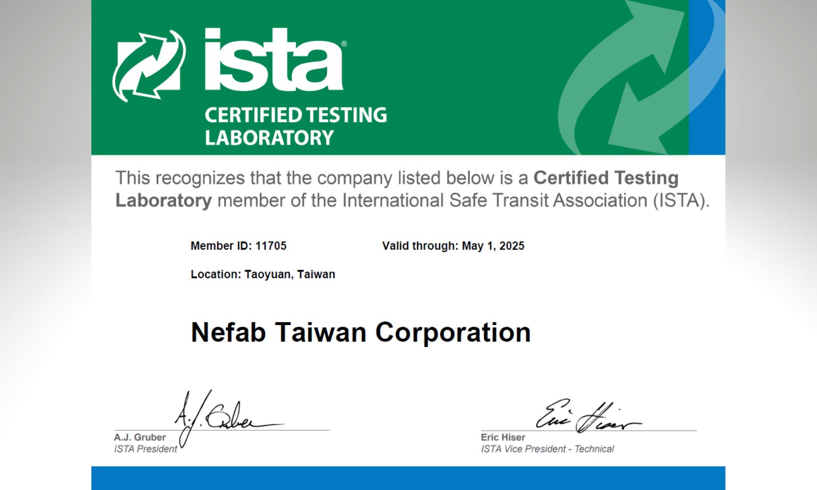 Vi er glade for å kunne kunngjøre at Nefabs testlaboratorium i Taoyuan i Taiwan har fått sertifisering fra International Safe Transit Association (ISTA).