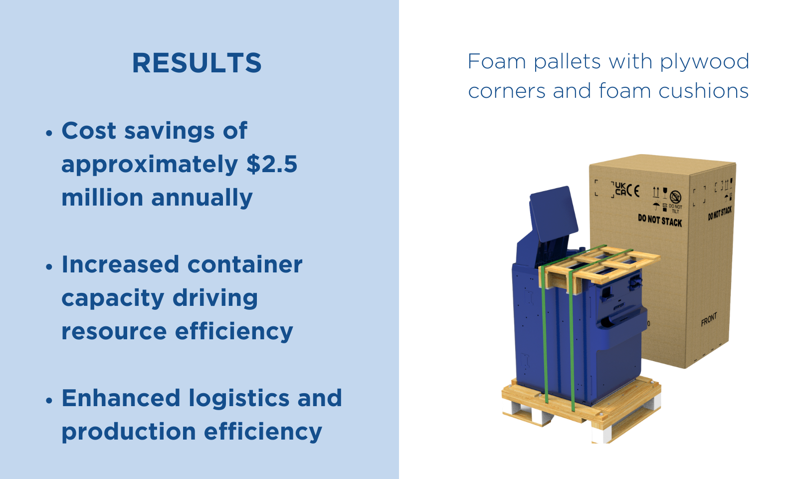 Wiodąca firma zajmująca się oprogramowaniem i technologią, dostarczająca produkty elektroniczne i profesjonalne usługi na całym świecie, stanęła przed krytycznymi wyzwaniami w procesie dystrybucji. Ich produkty, wysyłane na cały świat drogą morską, wymagały specjalistycznych opakowań do bezpiecznego transportu. Jednak ich własne projekty palet były nieefektywne, mieszcząc tylko 18 jednostek na pojemnik i sprawiając, że paczki nie nadawały się do układania w stosy. Stosowane materiały, w tym sklejka, drewno sosnowe i plastikowe pączki z poduszkami, miały wydłużony czas realizacji, wysokie minimalne ilości zamówień i przyczyniały się do wzrostu kosztów w okresie, gdy ceny kontenerów wzrosły o 400%.