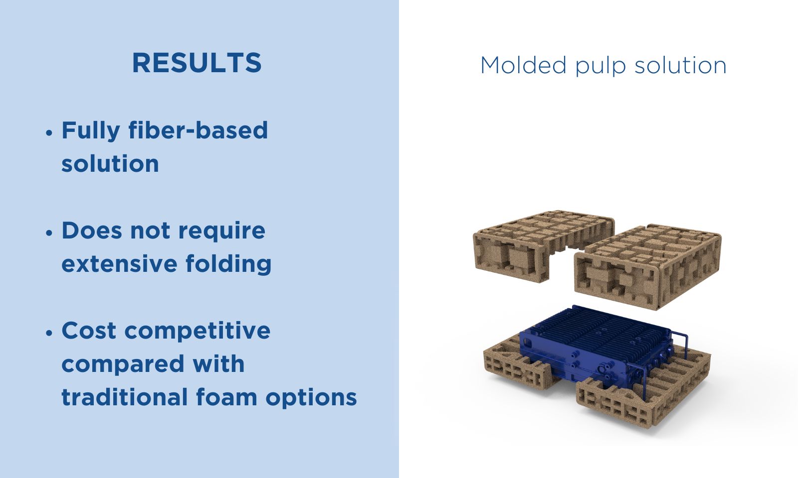 Nefab zaproponował rozwiązanie z formowanej masy celulozowej. Po kilku iteracjach projektu i szeroko zakrojonych wspólnych testach z klientem, osiągnęliśmy projekt, który przeszedł testy bez uwag.