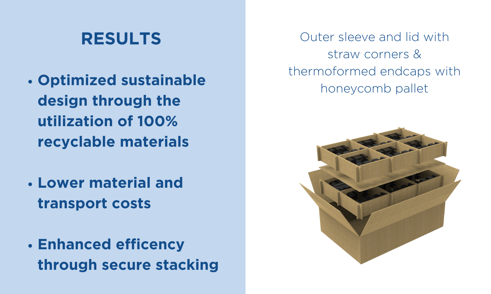 Nefab zaproponował całościowe rozwiązanie składające się z termoformowanych zaślepek wraz z wewnętrznym rusztem falistym. Całość została zapakowana w pudełko z tektury falistej z zewnętrznym rękawem i pokrywą, wzmocnione narożnikami ze słomy. Wreszcie, zespół zaproponował wykorzystanie palety o strukturze plastra mi odu w celu zastąpienia tradycyjnych palet drewnianych. Ogólnie rzecz biorąc, stworzyliśmy rozwiązanie opakowaniowe, które było w pełni zgodne z wymogami zrównoważonego rozwoju określonymi zarówno przez naszego klienta, jak i jego klienta.