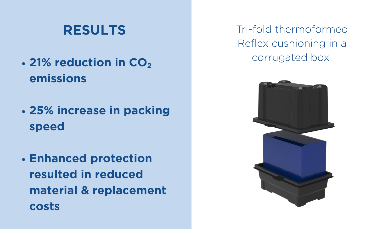 Aby rozwiązać te problemy, opracowano niestandardowe rozwiązanie -potrójną termoformowaną poduszkę Reflex z HDPE. Ta innowacyjna konstrukcja bezpiecznie owija się wokół produktu, zapewniając optymalną ochronę podczas transportu. Poduszka jest wykonana w 100% z HDPE pochodzącego z recyklingu, który w pełni nadaje się do recyklingu.