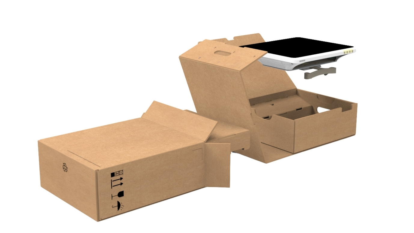 Ambalajul pentru monitoare din carton ondulat, dezvoltat pentru monitoarele pentru pacienți CARESCAPE Canvas™ de la GE HealthCare, asigură un transport durabil și protector pentru monitoarele din sticlă de mare valoare.