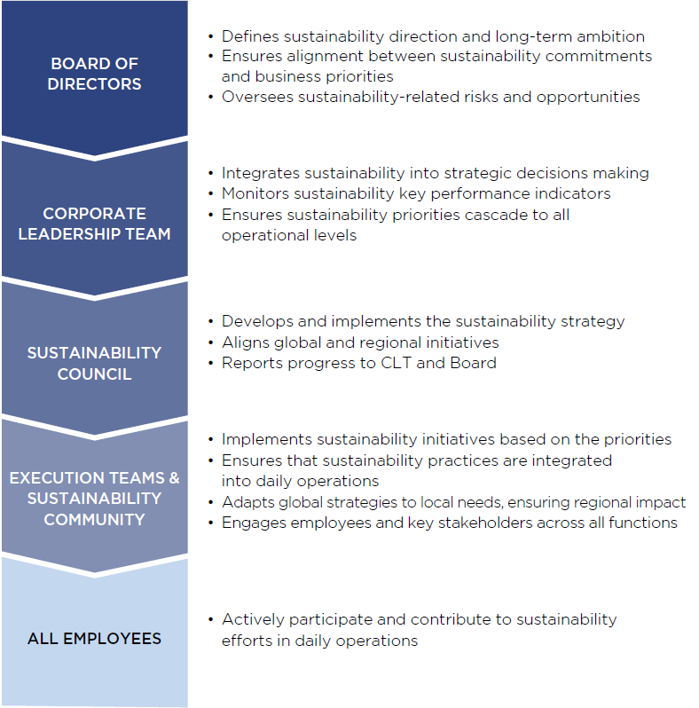 In 2023, Nefab launched its corporate strategy with five strategic areas, one of which is "Sustainability as a foundation for growth." This reflects our commitment to embedding sustainability in everything we do and prioritizing it at every level, from the Board of Directors to local operational departments. To reinforce this, we have introduced a Sustainability Directive that establishes sustainability as a pillar of our corporate governance model. This directive serves as a guiding framework, aligning sustainability efforts across the organization while incorporating key policies such as the Environmental Policy, Code of Conduct, Health and Safety Policy, and Human Resources Policy. By embedding sustainability into our corporate governance, we ensure a holistic and accountable approach to driving long-term positive impact.
