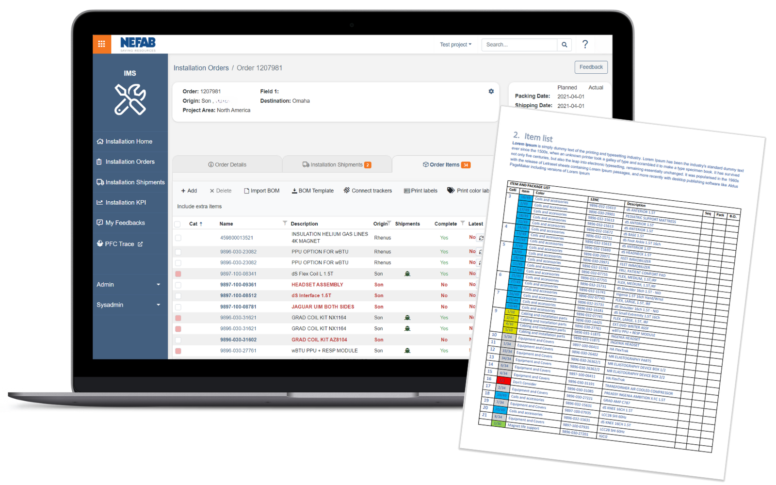 Thiết bị từ các ngành công nghiệp như chăm sóc sức khỏe, hệ thống điện, tuabin gió, khai thác mỏ và viễn thông được chuyển đến các địa điểm lắp đặt, nơi các nhóm kỹ thuật đến để lắp đặt thiết bị. Tuy nhiên, 20-40% cài đặt không phải là "lần đầu tiên đúng" vì một số bộ phận cần thiết bị thiếu, hư hỏng hoặc sai. Nefab đã giải quyết nhu cầu cài đặt "lần đầu tiên đúng" thông qua việc phát triển Nền tảng quản lý cài đặt của chúng tôi. Phần mềm Theo dõi và Theo dõi Quản lý Cài đặt toàn diện của chúng tôi cung cấp dịch vụ hai phần liền mạch được thiết kế riêng để đáp ứng nhu cầu cài đặt của bạn.